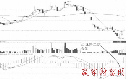 如下圖所示,ST澄海的下跌趨勢是相當明確的。但就是在這樣明確的下跌趨勢當中,MACD曲線卻沒有延續(xù)下跌的趨勢。圖中D位置對應的曲線顯然是比C位置升高了許多,而該股的股價卻創(chuàng)出8.08元的新低,說明MACD指標已和股價出現(xiàn)了非常顯著的背離走勢。而背離之后的圖中D位置出現(xiàn)的金叉已向投資者顯示出買入股票的信號,這時候建倉之后獲利將比較有把握。原因就是金叉出現(xiàn)在底部背離之后,并且該股是以四連陽的形式連續(xù)上漲形成MACD金叉的,買入信號的說服力更強一些。