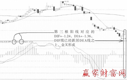 而從MACD指標上來看,就是這一根陽線形成之后,DIF數(shù)值已經(jīng)增加到-1.24.,DEA數(shù)道已經(jīng)相對減小到-1.36。顯然,DIF躍居DEA曲線之上,金叉買入形態(tài)出現(xiàn),投資者可以買入股票了。