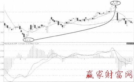在熊市比較長的下跌趨勢中,股價日復一日地下跌,沒有任何反轉(zhuǎn)的跡象,出現(xiàn)股票被套的情況。但從MACD曲線的變化趨勢上來看,確已出現(xiàn)了非常顯著的觸底反彈行情。MACD與股價出現(xiàn)背離的時間越長,出現(xiàn)金叉之后建倉的效果就更好。如果投資者判斷下跌的趨勢持續(xù)的時間不會太長,半年之內(nèi)市場就會重回升勢的話,基本上一兩次的背離之后出現(xiàn)的MACD金叉就可以作為投資者建倉的依據(jù)。