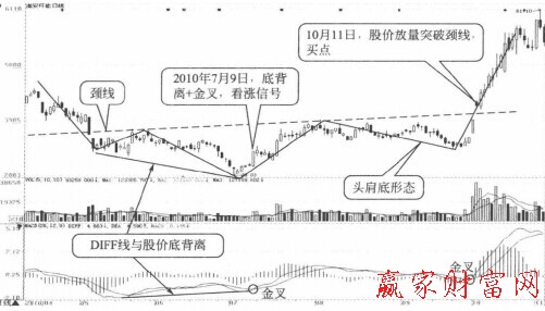 從8月開(kāi)始,股價(jià)開(kāi)始沖高回落但得到支撐,逐漸形成頭肩底形態(tài)。10月8日,MACD形成“零抽附近金叉”的看漲信號(hào)。10月11日,股價(jià)放量突破頭肩底形態(tài)頸線。這兩個(gè)買(mǎi)點(diǎn)幾乎同時(shí)出現(xiàn),更增加了看漲意義可靠性。投資者可以果斷買(mǎi)入。