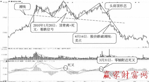 ?、?MACD指標(biāo)"DIFF線與股價(jià)頂背離十死叉”出現(xiàn)后,股價(jià)一般都出現(xiàn)一波下跌走勢(shì),但走勢(shì)能否徹底反轉(zhuǎn)還不一定。而頭肩頂形態(tài)的逐步形成,將鎖定“徹底反轉(zhuǎn)”的可能性。因此,在股價(jià)跌破頸線時(shí),投資者要注意果斷出場(chǎng)。