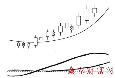 4.當(dāng)DIF線和MACD線先后向上突破0值線時(shí),說明該股股價(jià)開始進(jìn)入中期上升階段。這是日MACD指標(biāo)顯示的持股待漲信號(hào)之一。如圖所示。