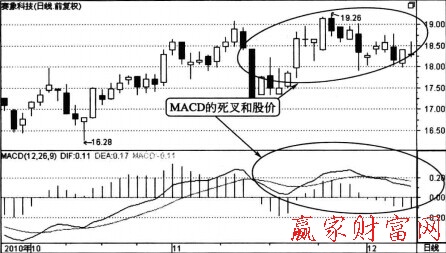 從圖2中可以看出,該股在一個(gè)高位平臺(tái)的19元出現(xiàn)了一個(gè)烏云蓋頂,同時(shí)MACD也出現(xiàn)死叉,但死叉后并非馬上開始下跌,這說明死叉并不能判斷,如圖3所示。