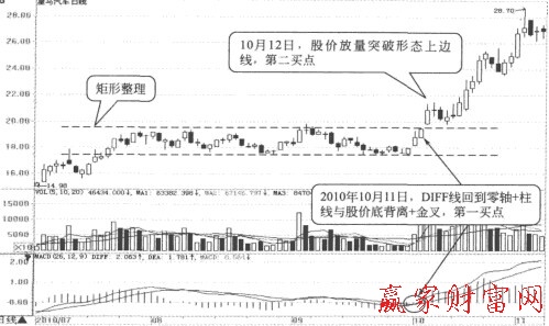 第一買點:DIFF線回到零軸+柱線底背離+MACD金叉。