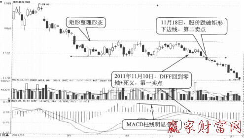 11月10日,MACD形成DIFF線回到零軸+死叉的看跌信號,第一賣點出現(xiàn)。之后股價和DIFF線繼續(xù)下跌。11月18日,股價跌破矩形下邊線,第二賣點出現(xiàn)。投資者要注意把握這兩個賣點,否則將被套牢。