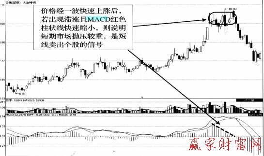 圖1為大冶特鋼(000708) 2009年3月4日至2009年8月20日期間走勢圖。如圖所示,在此股的一波快速上漲走勢中,MACD的紅色住狀線也快速放大(注:零軸上方的柱狀線為紅色,代表個股當前買盤力量強于賣盤;零軸下方的柱狀線為綠色,代表個股當前賣盤力量強于買盤),這表明個股處于買盤力量顯著強于賣盤力量的狀態(tài)下,但上漲走勢勢必會引發(fā)更多持股者的拋售意愿,而且買盤的力量也不可能一直占據(jù)優(yōu)勢,當個股于一波快速上漲后出現(xiàn)滯漲且紅色柱狀線快速縮小時,說明買盤力量開始變?nèi)酰u盤力量則正在加強,因而,是短線賣出個股的時機。