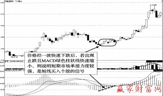 圖2為ST能山(000720)2008年10月23日至2009年2月20日期間走勢圖,如圖所示,在此股的一波下跌走勢后,MACD的綠色柱狀線也快速放大,這表明個股處于賣盤力量顯著強于買盤力量的狀態(tài)下,但下跌走勢勢必會引發(fā)更多的場外資金有抄底介入的意愿,而且賣盤的力量也會隨著價格下跌而減弱,不可能一直占據(jù)優(yōu)勢,當個股于一波下跌后出現(xiàn)止跌且綠色柱狀線快速縮小時,說明買盤力量開始變強,賣盤力量則正在減弱,因而,是短線買入個股的時機。