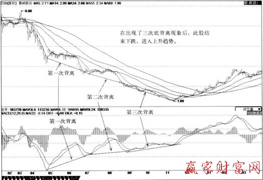 底背離是較為可靠的反彈信號(hào),多數(shù)情況下,在出現(xiàn)底背離現(xiàn)象后股價(jià)都會(huì)形成一波上漲走勢(shì)。但是如果利用底背離進(jìn)行抄底,那么在出現(xiàn)一次底背離就匆忙買入,極易被套。這是因?yàn)椋碌厔?shì)形成后,在下跌途中會(huì)出現(xiàn)盤整或是反彈的走勢(shì),此時(shí)的MACD黃白線經(jīng)常會(huì)發(fā)生底背離的現(xiàn)象。由于只是盤整或反彈,待盤整或反彈結(jié)束后股價(jià)會(huì)重新向下滑落,在下跌的途中又會(huì)出現(xiàn)新的盤整或是反彈走勢(shì),那么MACD的底背離也會(huì)出現(xiàn)多次,也就是背離后的再次背離,因此如果見到底背離就以為股價(jià)見底而開倉(cāng)買入,就容易被套住。