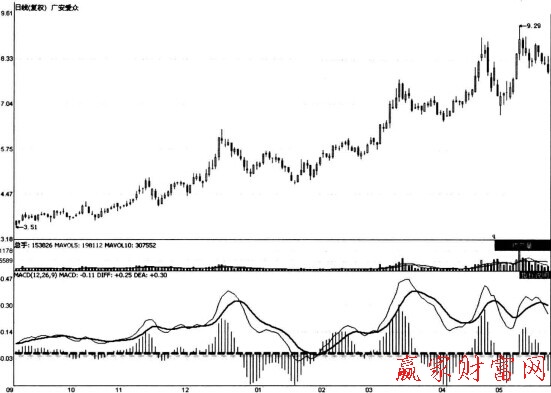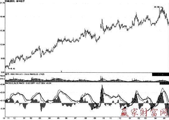 上升過程中,偶爾有向下跌破零軸的情況,但這并不代表升勢結束。只是短期回調走勢所致。對于中長線的持股者來說,可以繼續(xù)觀察,如果DIF線隨后能再度返回至零軸上方,就說明升勢仍將持續(xù)下去。上圖所示為新華醫(yī)療2008年10月至2010年5月期間走勢圖,此股在震蕩上揚的過程中,DIFF線多次向下跌破零軸,但停留在零軸下方的時間很短,這種偶然性的躍動無損于升勢的持續(xù)。