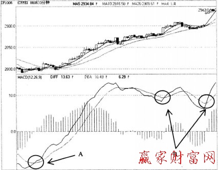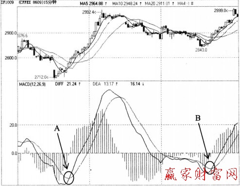 下圖是IF1009的15分鐘K線圖。在A處,MACD在負值區(qū)域形成了黃金交叉,同時期價已站上10均線,并且5均線與10均線形成了金叉,所以這里出現(xiàn)了技術(shù)共振,即多項技術(shù)都顯示了買入做多信號,這時操作成功概率是相當大的。