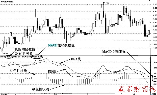 3.指標(biāo)本身與股價的背離情況。如MACD雙均線在窗口頂部與底部的階段性波動是否與股價走勢相背離、DIF線是否與柱狀線走勢相背離、股價走勢是否與柱狀線走勢相背離等。