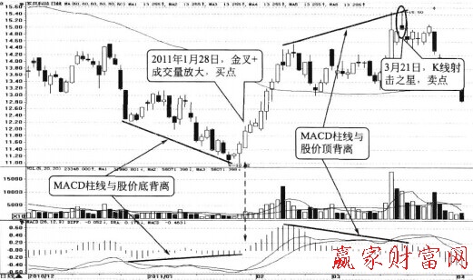 如圖所示,2011年1月,東風(fēng)科技(600081)在MACD指標(biāo)出現(xiàn)MACD柱線與股價(jià)底背離的態(tài)勢,而1月28日形成金叉,同時(shí)成交量逐漸放大。這表明一波上漲走勢即將形成,投資者可以果斷買入,之后股價(jià)一路上漲,2011年3月21日,該股出現(xiàn)K線射擊之星形態(tài)的賣出信號,而此前一段時(shí)間的MACD柱線與股價(jià)出現(xiàn)頂背離,投資者要注意把握這個(gè)波段賣點(diǎn)。