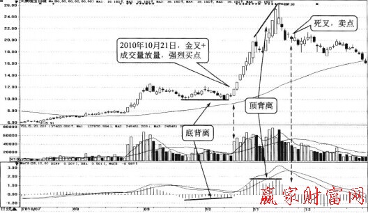 如圖所示,2010年10月21日,太原剛玉(000795)的MACD指標(biāo)現(xiàn)“MACD柱線與股價(jià)底背離+金叉”的買入信號,同時(shí)成交量也突然放出巨量,均量線指標(biāo)出現(xiàn)金叉,投資者可以果斷買入。