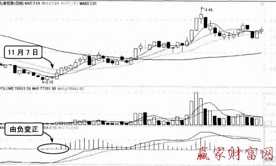 如圖所示,七喜控股(002027)在2008年11月7日之前,MACD參數(shù)由負(fù)轉(zhuǎn)為正,意味短期走勢將變強(qiáng),后市可能進(jìn)入反彈行情。果然,從11月7日開始,七喜控股股價(jià)開始反彈,成交量也逐步放大,最終從2元上漲到4.4元,漲幅超100%。