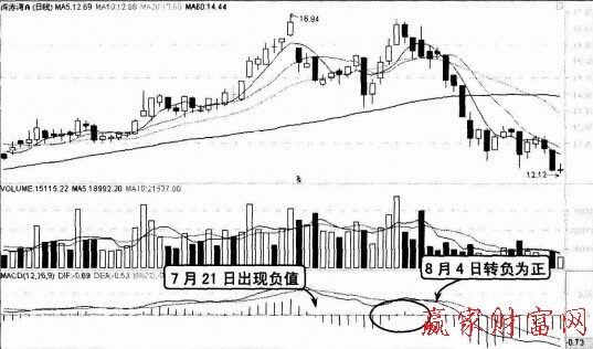 如圖所示,深赤灣A (000022)在2009年5月到7月走出一路上漲行情,MACD指標(biāo)大部分時(shí)間都是正值,直到7月21日股價(jià)出現(xiàn)較大幅度下跌,MACD才重新回到負(fù)值。8月4日,MACD從負(fù)值轉(zhuǎn)成正值,此時(shí)按照MACD由負(fù)轉(zhuǎn)正的規(guī)律,股民進(jìn)場購買股票。