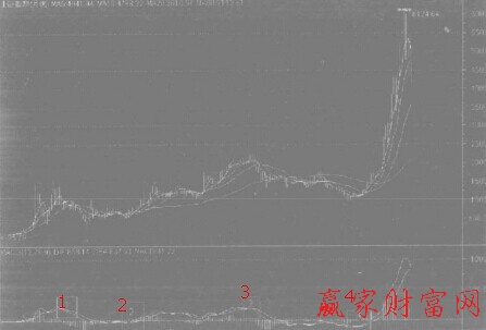 2.當(dāng)DIF在0軸上方下穿DEA的時(shí)候,是熊市到來的征兆(圖2中的1和3);當(dāng)DIF在0軸下方上穿DEA時(shí),是牛市到來的征兆(圖2-9一11中的2和4)。在圖的右側(cè)是2008年春節(jié)前后的月K線,已經(jīng)出現(xiàn)月線DIF即將下穿DEA的跡象,對中長期走勢,是一種不好的提示。