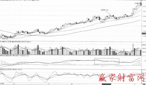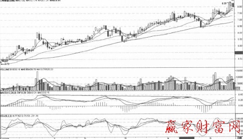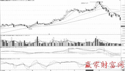 如上圖所示,寧波銀行逐波上漲,漲幅較大。在高位橫盤后再度上行,2009年7月31日,該股繼續(xù)創(chuàng)新高,但是此時(shí)的MACD指標(biāo)線高點(diǎn)卻明顯低于前期高點(diǎn),總體呈下降趨勢(shì),這是典型的股價(jià)與指標(biāo)的頂背離。說明此次上漲的強(qiáng)度明顯下降,后市股價(jià)很可能很快見頂回落,投資者應(yīng)逢高出局。該股后市果然很快反轉(zhuǎn)下行,跌幅很大。可見股價(jià)與MACD指標(biāo)頂背離是一個(gè)很好的賣出信號(hào)。