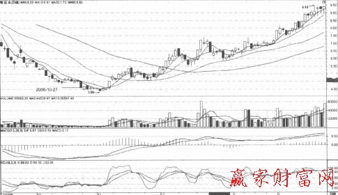 如圖所示,梅花傘在2008年跟隨大盤大幅下挫,到當(dāng)年10月仍然在無量空跌,市場極度低迷。10月27日,該股繼續(xù)下跌,收出中陰線,但此時(shí)MACD指標(biāo)線卻明顯上移,這是典型的股價(jià)與指標(biāo)的背離。股價(jià)與MACD指標(biāo)底背離說明多頭在逐步走強(qiáng),后市有望止跌反彈。此后該股果然止跌,筑底后更是加速上行,漲幅巨大。這說明股價(jià)與MACD指標(biāo)產(chǎn)生底背離是股價(jià)即將見底的信號(hào),股價(jià)有望很快止跌反彈,投資者可逢低介入。