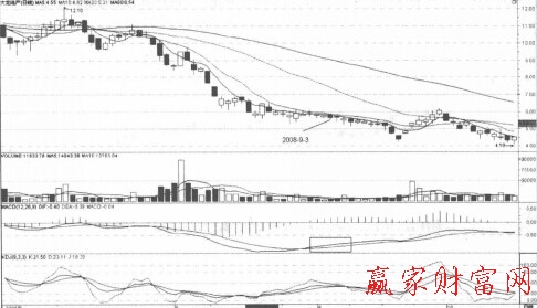 如圖所示,大龍地產(chǎn)2008年也是大幅下跌,當(dāng)年8月底,該股走出眾多的小陰線和小陽線,股價(jià)跌勢明顯趨緩。2008年9月3日該股收出小陰線,但是MACD指標(biāo)線卻明顯在上行,這是典型的股價(jià)與指標(biāo)背離,說明短線股價(jià)走勢正在走強(qiáng),后市有望止跌反彈??稍摴纱撕蟛]有止跌,反而繼續(xù)下跌,跌幅不小。這說明前面的底背離是個(gè)小小的陷阱,讓過早介入的投資者損失不小。
