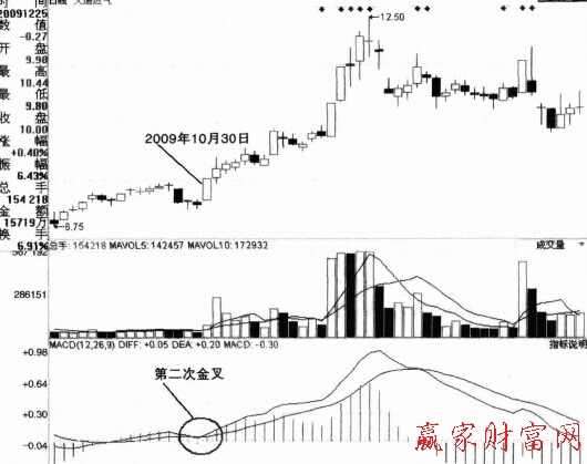 例如:大通燃?xì)?000593)在2009年10月30日MACD出現(xiàn)第二次金叉,當(dāng)日K線收陽,前兩日K線為小星線,此時(shí)買入,其后有一波50%的漲幅。如圖所示。