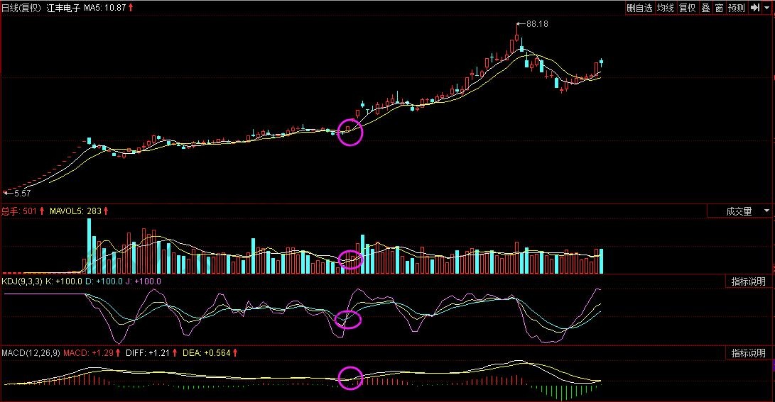 300666江豐電子在2017年9月下旬開始的一波上漲,KDJ先形成金叉,后面5日和10日均線、MACD、5日和10均量線也都前后形成金叉,四個(gè)指標(biāo)共振,形成標(biāo)準(zhǔn)的四喜臨門。