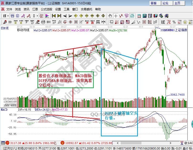 在一輪多頭行情中,價(jià)格是創(chuàng)新高后還有新高,均線是完美的多頭排列,光看價(jià)格和均線似乎上漲行情會沒完沒了。 然而,當(dāng)市場情緒完全被當(dāng)前趨勢所感染的時(shí)候,市場往往已經(jīng)運(yùn)行盡頭。這時(shí)侯上漲空間有限,而下行空間無限。 而用MACD的背離是一帖有效的清醒劑,往往可以提醒投機(jī)者行情隨時(shí)有結(jié)束的可能性。