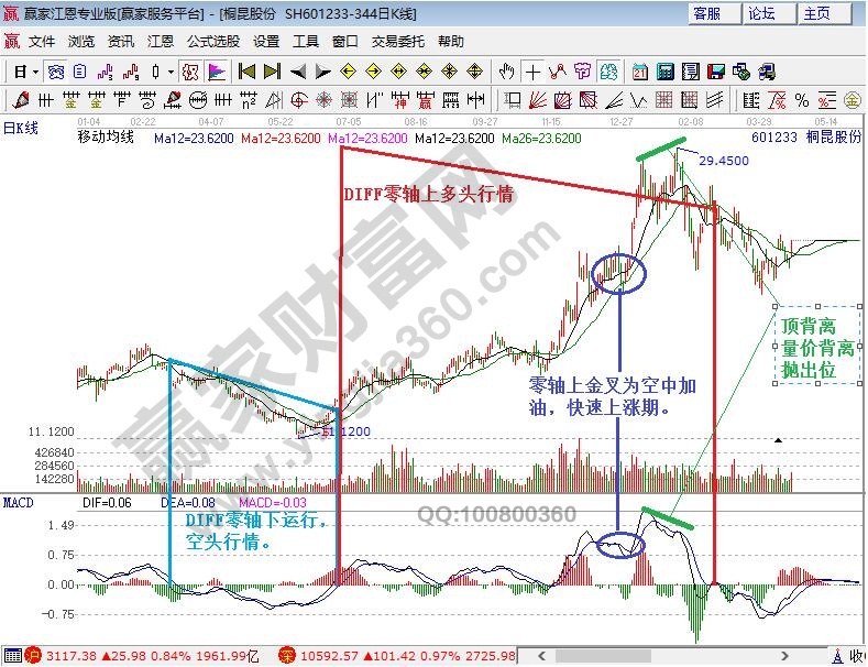 由于是用均線原理做出來的,那么多頭排列與空頭排列是確定多空趨勢的根據(jù)。0軸是多空平衡線,DIFF和DEA在零軸上方是多頭行情,在零軸下方是空頭行情,在零軸附近是振蕩盤整行情,也就是平衡市。