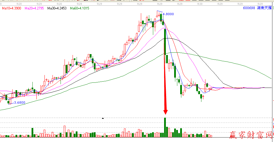 600698湖南天雁前期連續(xù)小陽線拉起,一直到2014年4月23號出現(xiàn)一個吊頂小陽線,市場見頂。之后四天之內(nèi)連續(xù)拉起大陰線,連續(xù)下跌,整個下跌過程中,放出巨量,此時不能因為連續(xù)下跌而止跌。入場要謹慎。