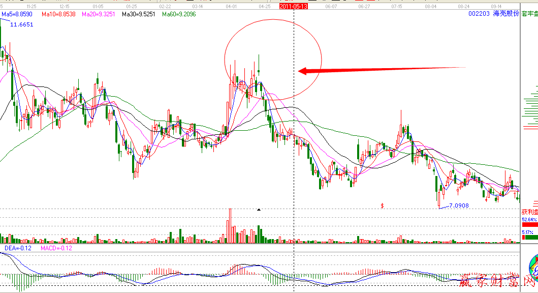 002203海量股份屬于創(chuàng)業(yè)板板塊、醫(yī)藥行業(yè)板塊。在這一個股中,2011年4月股票上漲實現(xiàn)拉升,出現(xiàn)跳空高開,股票價格當(dāng)天收十字星,第二天會出現(xiàn)跳空高開或者跳空低開,收于中長陰線或者中長陽線,表示股票價格上漲或者下跌幅度過大,股票價格向下調(diào)整或者上漲的時機已經(jīng)到來。
