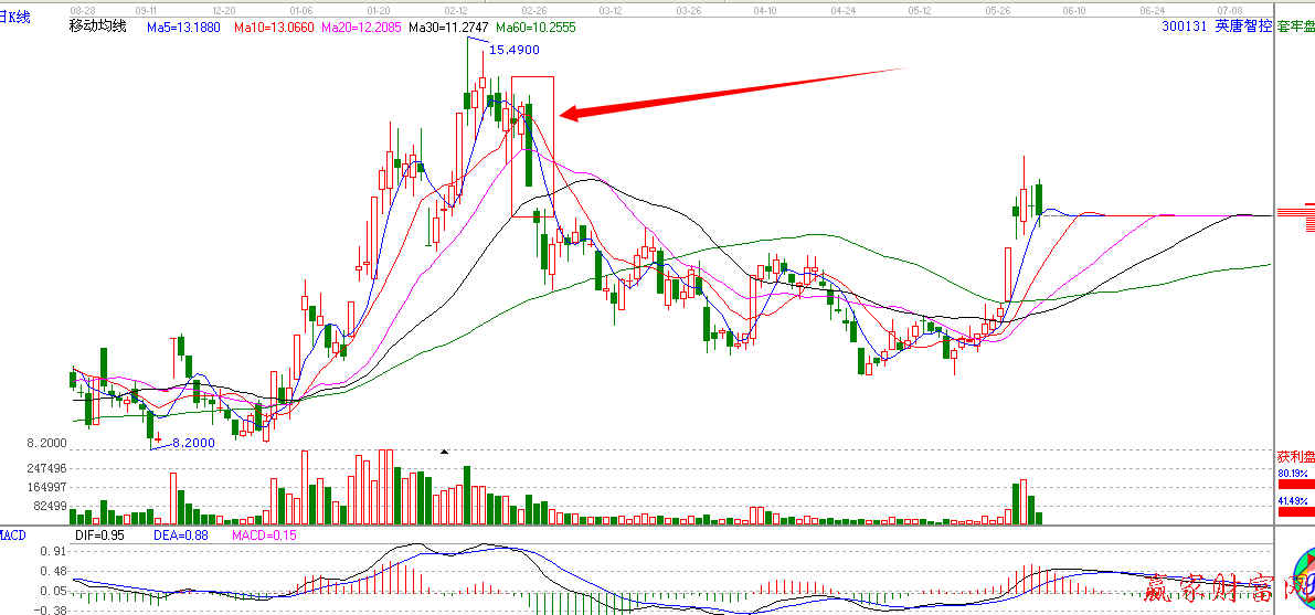300131英唐智控屬于智能家居、電子元件板塊,股價前期拉升,在2014年2月24日出現(xiàn)一根陽線實體,之后第二天陰線跳空高開,但是第二天直接放量收陰線吞掉前一天大陽線,收盤跌破前一天開盤價的支撐位,形成高位的陰包陽,