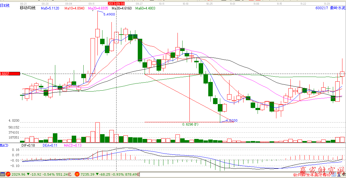 600217屬于絲綢之路板塊,水泥建材板塊,在2013年9月12日出現5.49元的一個高點,前期的拉升中