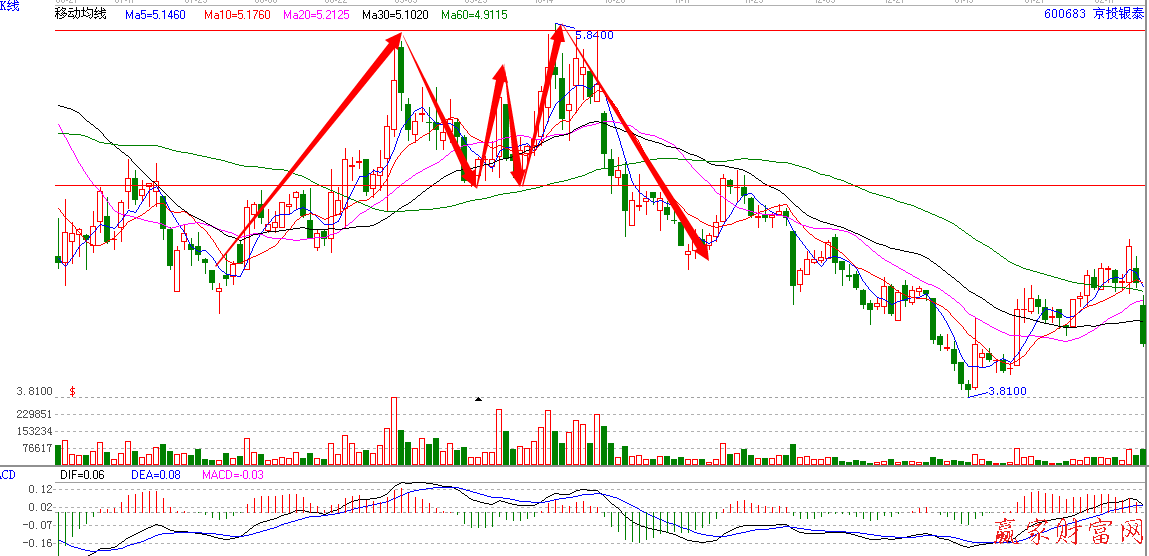 賣出技巧可以參考的各種指標判斷頂部進行賣出,可以參考的指標一般有趨勢線、K線形態(tài)、K線組合以及籌碼分布等多種指標。前面我們已經(jīng)介紹過集中經(jīng)典的頂部信號來指示賣出,現(xiàn)在介紹另外一種頂部形態(tài)的