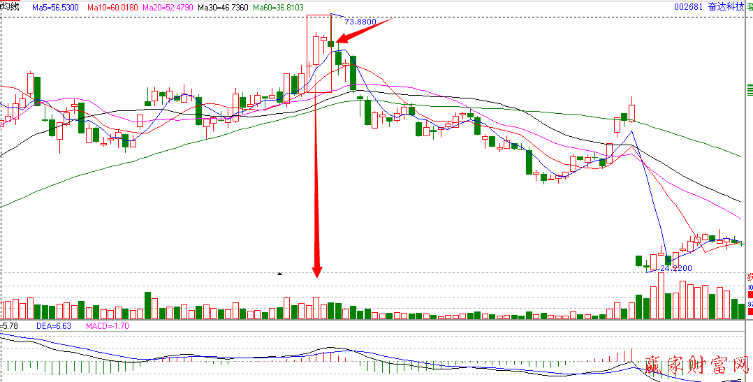002681奮達(dá)科技屬于家電行業(yè)板塊、智能穿戴板塊,股價(jià)2013年12月4日出現(xiàn)高點(diǎn),之后一直在高位進(jìn)行橫盤整理,幅度較小。2014年2月18號(hào),拉起大陽線,當(dāng)天出現(xiàn)拉升,但是第二天的拉升卻沒有實(shí)現(xiàn)最高價(jià)和最低價(jià)都要比前一天的要低,這是比較明顯的見頂信號(hào),投資者應(yīng)該正確設(shè)置