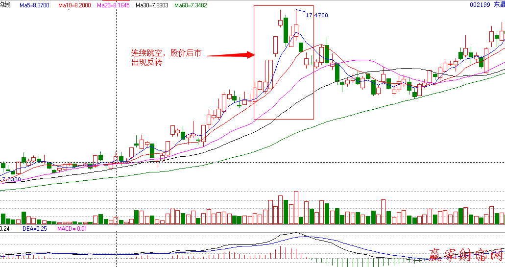 基本特征:我們本次分析是三空陽線的基本形態(tài)特征。一般是因為市場中出現(xiàn)突發(fā)性消息對個股構成利好,股價無法在一個交易日內對其完全消化,或者是個股的籌碼極度集中,主力在拉抬股價時阻力極小,以上兩種情況都有可能導致空頭斬倉盤的不斷增加,股價連續(xù)上沖,連續(xù)收陽線。但是股價出現(xiàn)多次跳空之后,能量已經基本釋放完成,所以后市的上漲空間已經減小。此時就是明顯的頂部反轉的信號。