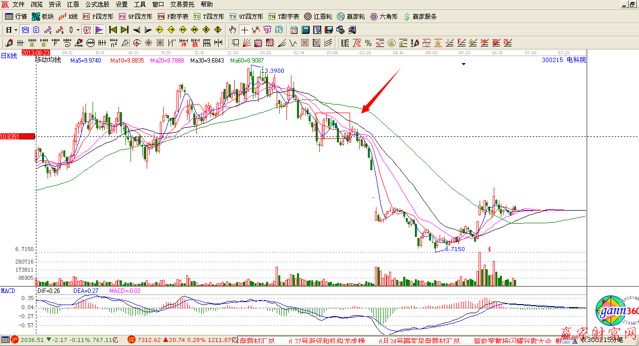 300215電科院屬于創(chuàng)業(yè)板塊、輸配電氣板塊,輸配電氣板塊前期到達高點之后,股價開始回落。2014年3月初,股價在下跌過程中出現(xiàn)小幅回落,回調(diào)由小陰線和小陽線組成,連續(xù)調(diào)整一直持續(xù)了5天,