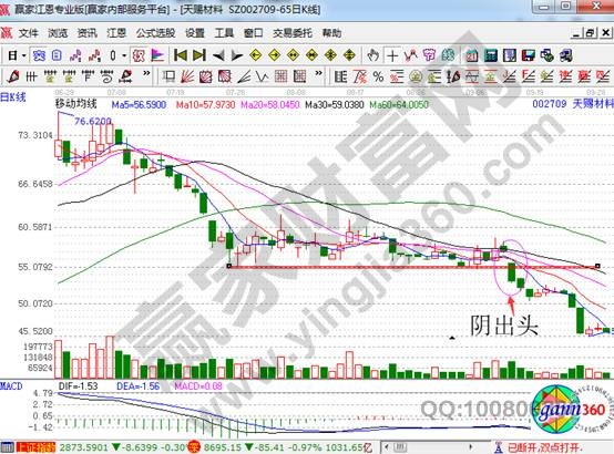 所謂的陰出頭,就是當(dāng)出現(xiàn)一根陰線擊穿重要自稱為,必須趕快進(jìn)行清倉。如下西的天賜材料走勢圖。