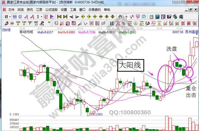 在大陽線第三天若個股仍下跌這時機會就在眼前了,應密切關注個股下跌的承接盤和下跌幅度,一般洗盤不會超過三天,有的兩天。再洗盤后發(fā)現(xiàn)個股小陽線盤升這時就可重倉買入,如下面的蘇州高新走勢圖。