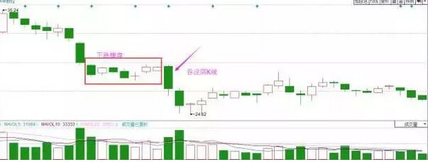 1、下跌趨勢中的陰K吞沒線。在下行趨勢中股價橫盤了一段時間之后,收出了一根中陰K線,并且該K線吞沒了前期多條小陰小陽K線,之后下跌行情繼續(xù),當橫盤后我們發(fā)現(xiàn)這根中陽或者大陽線的死后,最后的離場時機一定要把握好,如下圖所示。