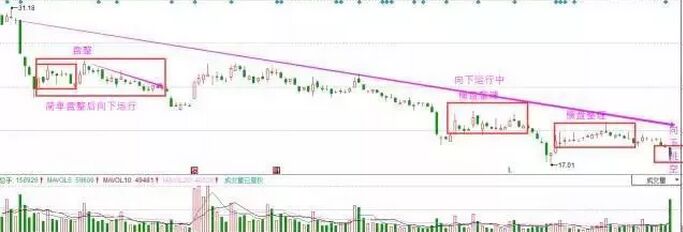 在下行趨勢中股價在經(jīng)歷了一段時間的下跌后,出現(xiàn)了短暫的盤整行情,但之后股價并沒有拐頭向上而是繼續(xù)向下運行。而且前期的盤整知識為了防止散戶投資者大量拋壓而造成股價大幅的下跌,橫盤其實只是一個誘餌,一旦你上當,那么后期那長長的下跌行情,就會令你非常痛苦。