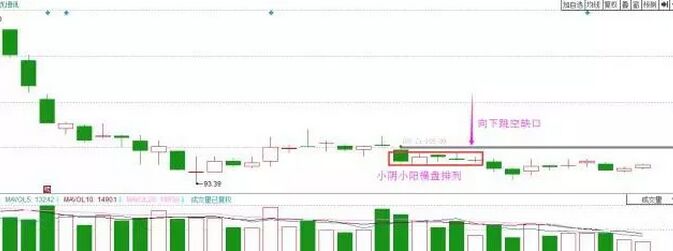4、向下跳空缺口后的并列陽線或陰陽線。在下行趨勢中出現(xiàn)向下跳空缺口,之后股價不是繼續(xù)下行,而是出現(xiàn)了小陰小陽的橫盤整理走勢,這其實是空方在聚焦力量為進一步下跌做準備,當出現(xiàn)這一走勢時我們就要選擇果斷離場,不要抱有過多的幻想。如下圖所示。