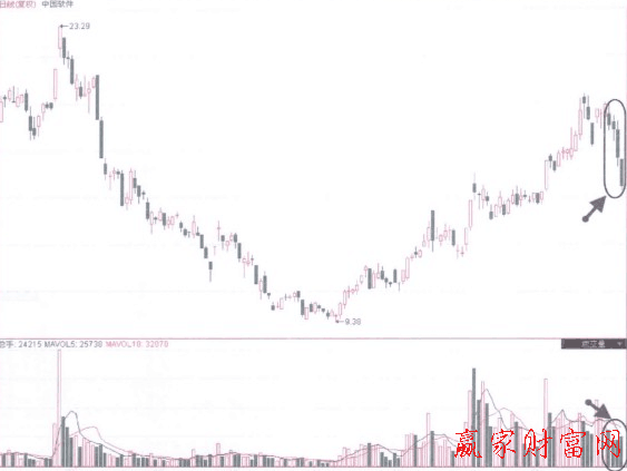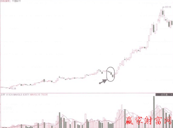 圖1為中國軟件(600536)2008年7月7日~2009年2月17日期間的走勢圖,此股在經(jīng)歷了2008年的大幅度下跌之后,于底部區(qū)出現(xiàn)了企位上行的走勢。在企穩(wěn)上行走勢中,我們可以看到量能明顯放大、牛長熊短的K線走勢、股價重心穩(wěn)步上移等體現(xiàn)主力建倉行為的盤口特征。但是,在待續(xù)攀升后的相對高點,如圖中箭頭標(biāo)注所示,此股卻出現(xiàn)了連續(xù)四個交易日的下跌,短期下跌幅度較大。但如果我們細心的話,就會發(fā)現(xiàn)這四日的成交量明顯萎縮,說明主力資金并沒有打壓出貨。對于大盤情況的知識,還是要做到心中有數(shù)。