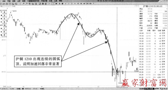 如圖所示,白糖1209合約出現(xiàn)的沖高回落的形態(tài),兩次都是圓弧頂形態(tài)。圓弧頂形態(tài)的重要特征:價格回落的速度是逐漸加速的。到了期貨價格真正回落的階段,滬銅1209合約兒乎出現(xiàn)了跌停的情況。顯然,投資者如果在這個時候操作期貨合約的話,猶豫當(dāng)中必然錯過做空獲利的機會或者喪失止損出局的好時機。