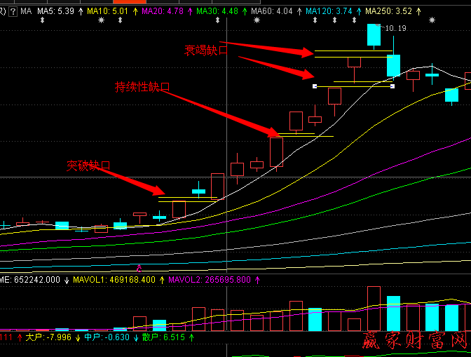 衰竭性缺口一般出現(xiàn)在持續(xù)性缺口之后,一般表現(xiàn)為,股價大幅波動中價格在奄奄一息中再次做最后掙扎式的向上,完成最后跳躍。然而最后的掙扎,顯然要注意的是最后兩字,隨后幾天價格馬上開始下滑。收市價格一旦低于此次跳空,就表明了衰竭缺口的形成。這種情形的一般意義為,短期頭部已經(jīng)形成,多頭完成最后一擊,維持原有增長趨勢的力量已經(jīng)減弱,股價即將進入整理或者反轉(zhuǎn)形態(tài)。