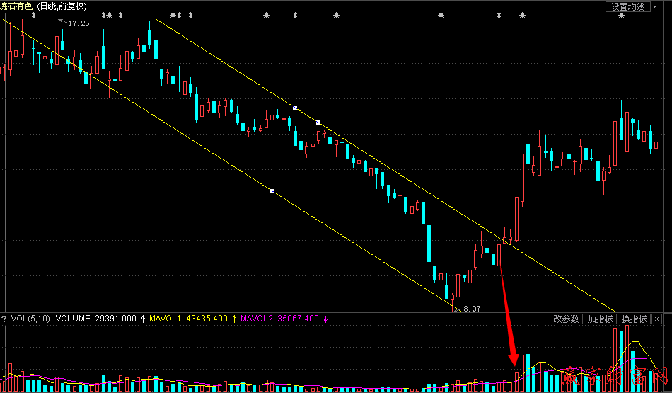 早晨之星,成為股市反轉(zhuǎn)上升的轉(zhuǎn)點。從趨勢線的分割來說,12月19日成交量在5.46萬,拉起大陽線橫穿3條均線。