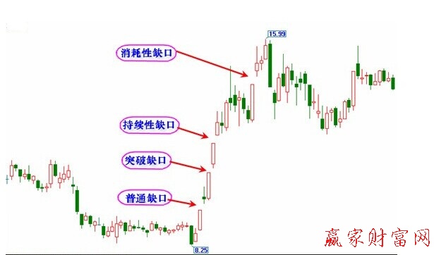 缺口是指股價在大幅度震蕩時,其中有一段價格是沒有任何交易,在K線圖上顯示的就是一個真空區(qū)域,我們稱之為缺口,或者稱為跳空。如果經過一段時間或很長時間股價反向變動使得真空區(qū)域被填上,我們稱為缺口被封閉,或者稱為補空。