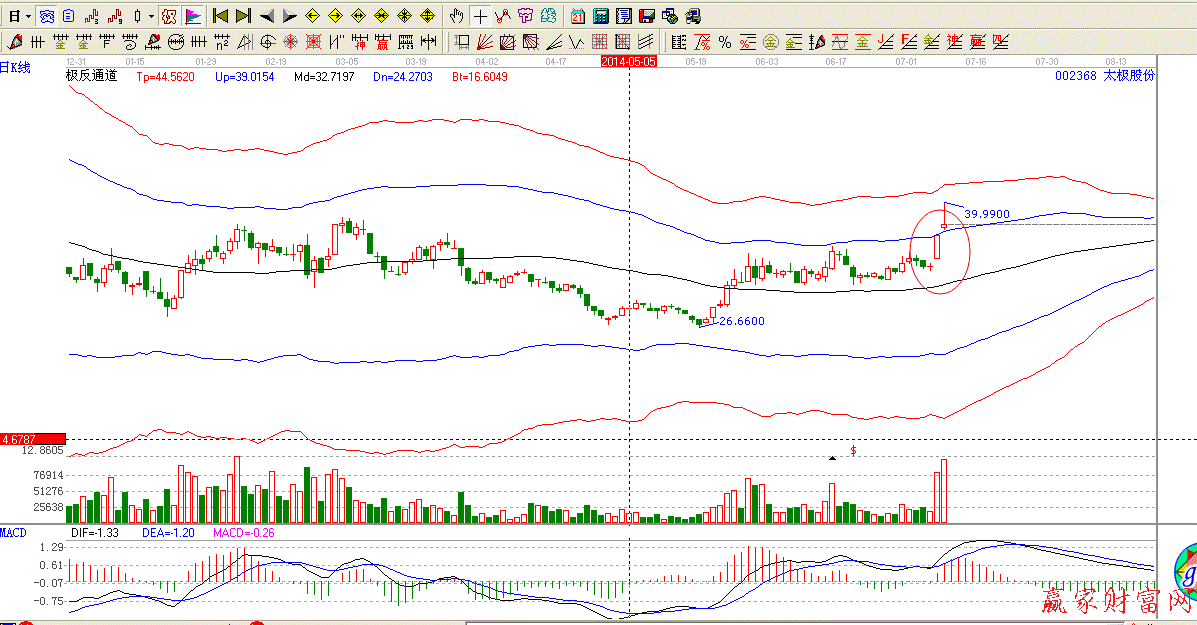 002368前期在生命線上強(qiáng)勢(shì)運(yùn)行,但是此時(shí)沒(méi)有成交量的配合,后市空間沒(méi)有打開(kāi)。之后大陽(yáng)線拉升實(shí)現(xiàn)向上的跳空,股價(jià)開(kāi)始強(qiáng)勢(shì)運(yùn)行,成家量的配合下,運(yùn)行一直很強(qiáng)勢(shì)。站穩(wěn)強(qiáng)勢(shì)外軌線之后看向超強(qiáng)外軌線。