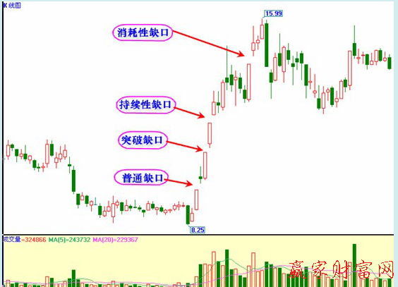 缺口的分類,缺口一般分為:普通缺口、突破缺口、持續(xù)性缺口、消耗性缺口、除權(quán)缺口五種。