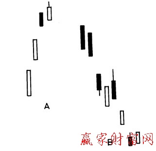 還有一空、二空、三空這些說法,如圖1中A所示,在上開市場(chǎng)中,第一條K線和第二條K線之間是第一個(gè)空跳缺口,稱為一空,第二條K線和第三條K線之間是第二個(gè)空跳缺口,稱為二空。相反,圖1中B所示,處于下跌市場(chǎng),一空在第二條K線和第三條K線之間,二空在第五條K線與第六條K線之間,三空在第六條K線與第七條K線之間,總共形成三個(gè)空跳缺口。