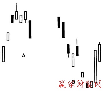 發(fā)生補(bǔ)缺口現(xiàn)象時(shí),表示沿市場(chǎng)運(yùn)動(dòng)方向的力量很強(qiáng),因此,可以得出結(jié)論,圖2A中價(jià)格還將繼續(xù)下降,圖2B中價(jià)格將會(huì)再度上揚(yáng)。