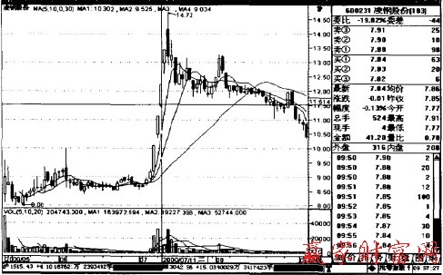 比如2000年7月11日凌鋼股份(600231)出現(xiàn)第二個上跳測量缺口,下沿在11.50元左右,而前期的平臺是8.5元左右,已漲3元,但用測量缺口計算還能再漲3元,即11.50元加上3元等于14.50元。而實際上此股在發(fā)生第三個缺口的第二天,即7月13日摸高14.72元后掉頭而下,僅比測量性缺口測出的理論高度高出0.25元,如下圖所示。